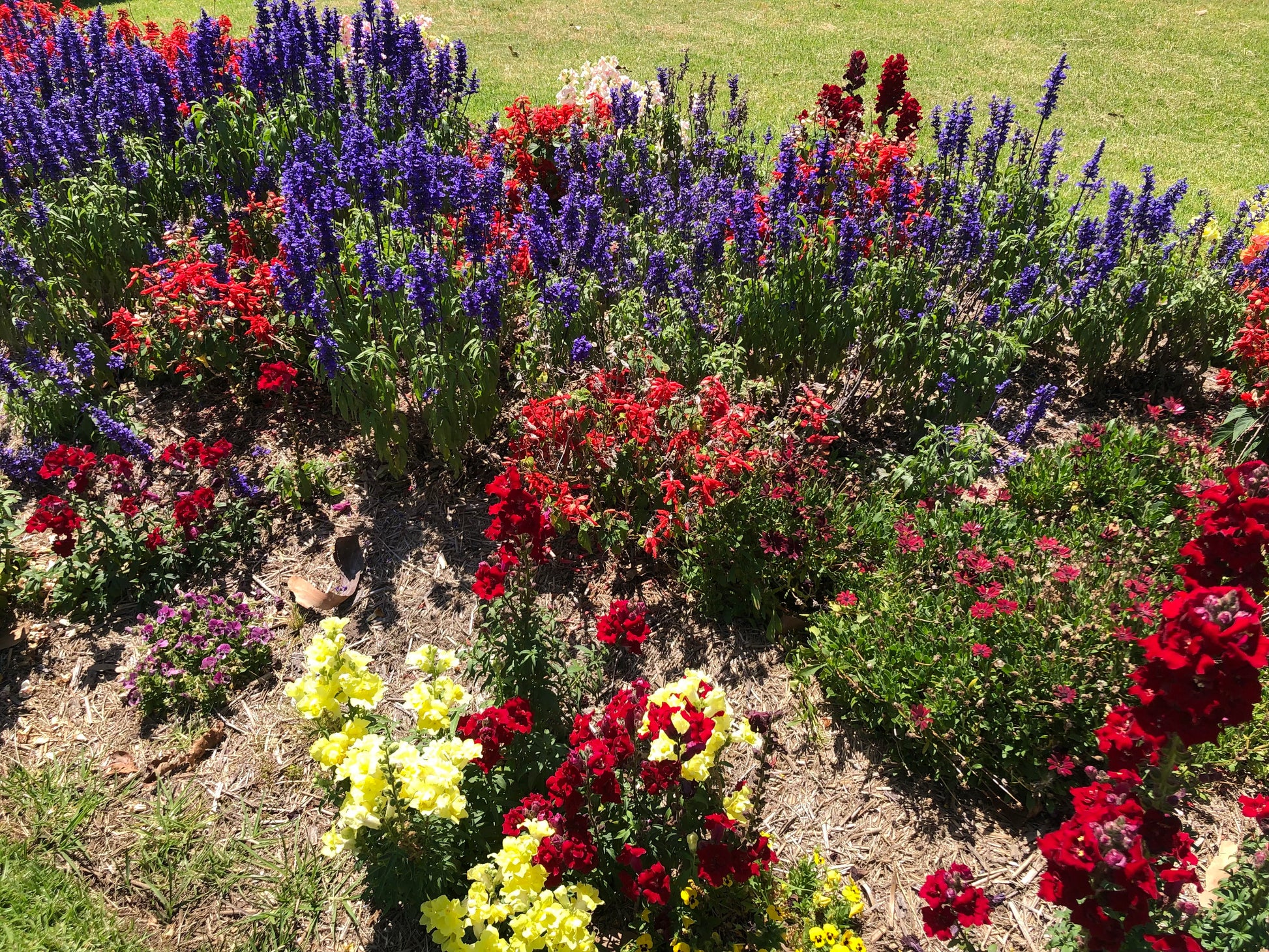 Fill your space with the cheerful energy of a vibrant garden with this photo of red, purple, and yellow blooms. The rich colours and delicate petal details highlight the natural beauty and texture of these flowers.